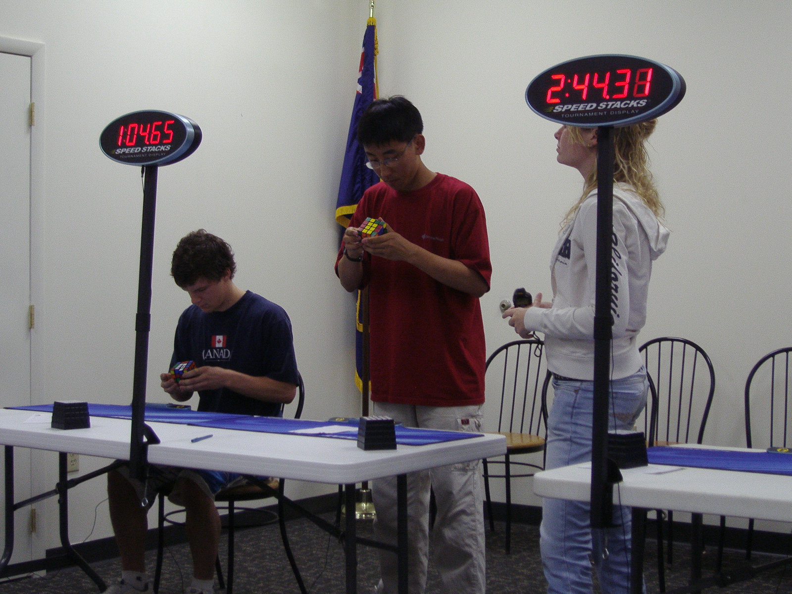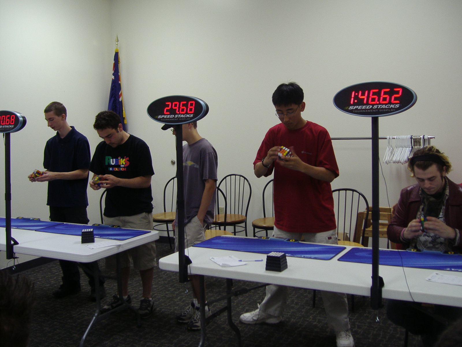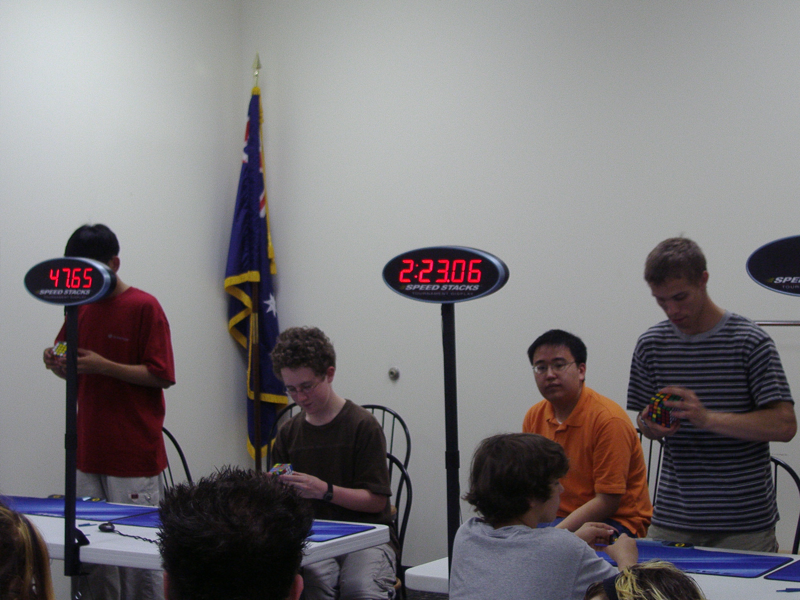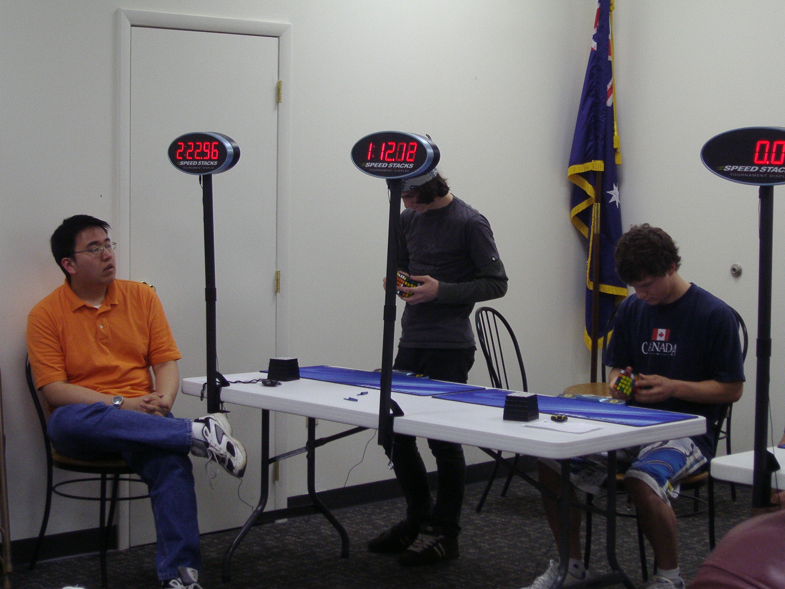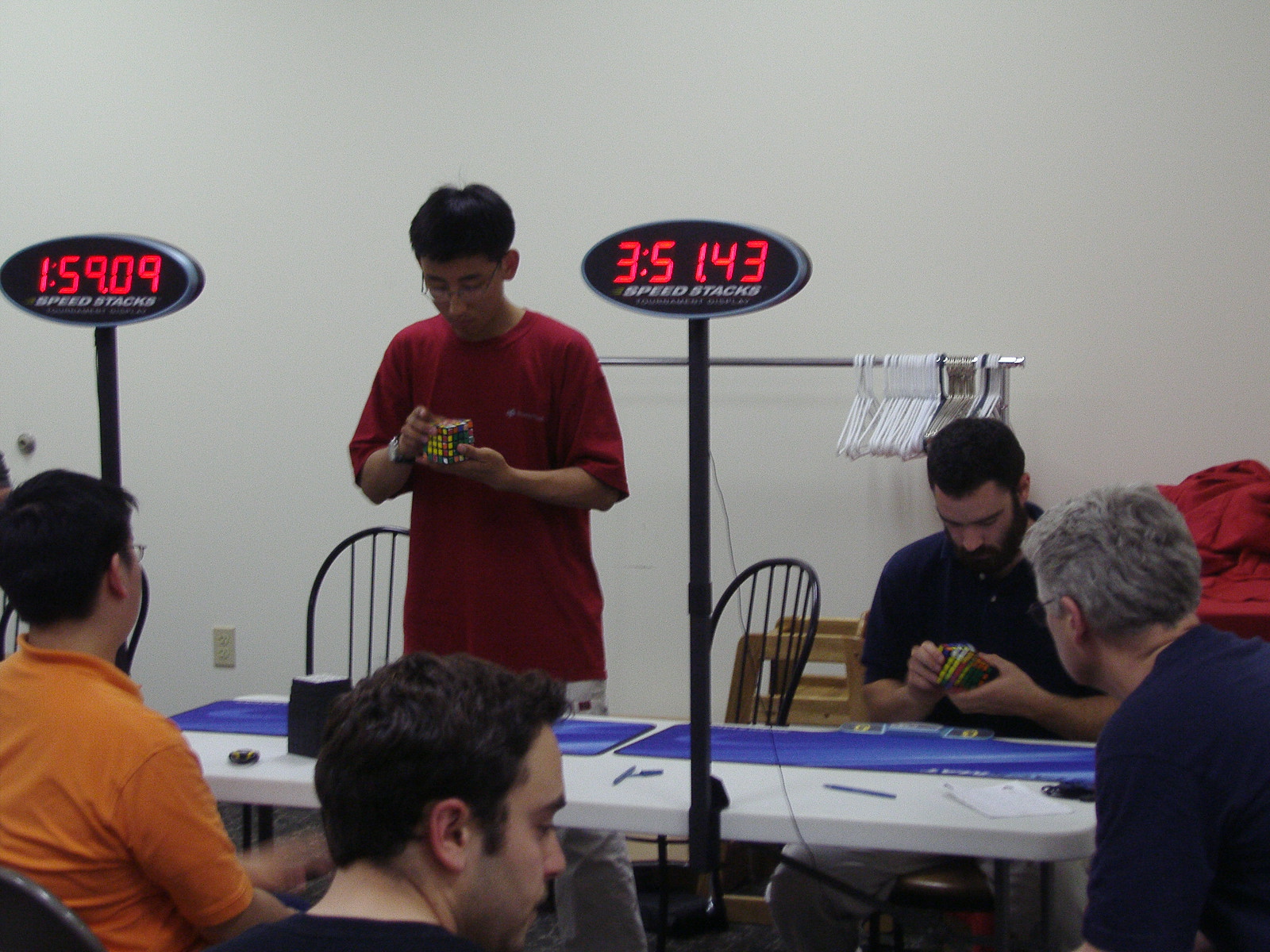 Competitors from left to right: me, Tim Reynolds, Nathaniel Day. My brother (orange shirt) is looking on as a judge. 5x5x5ing.
