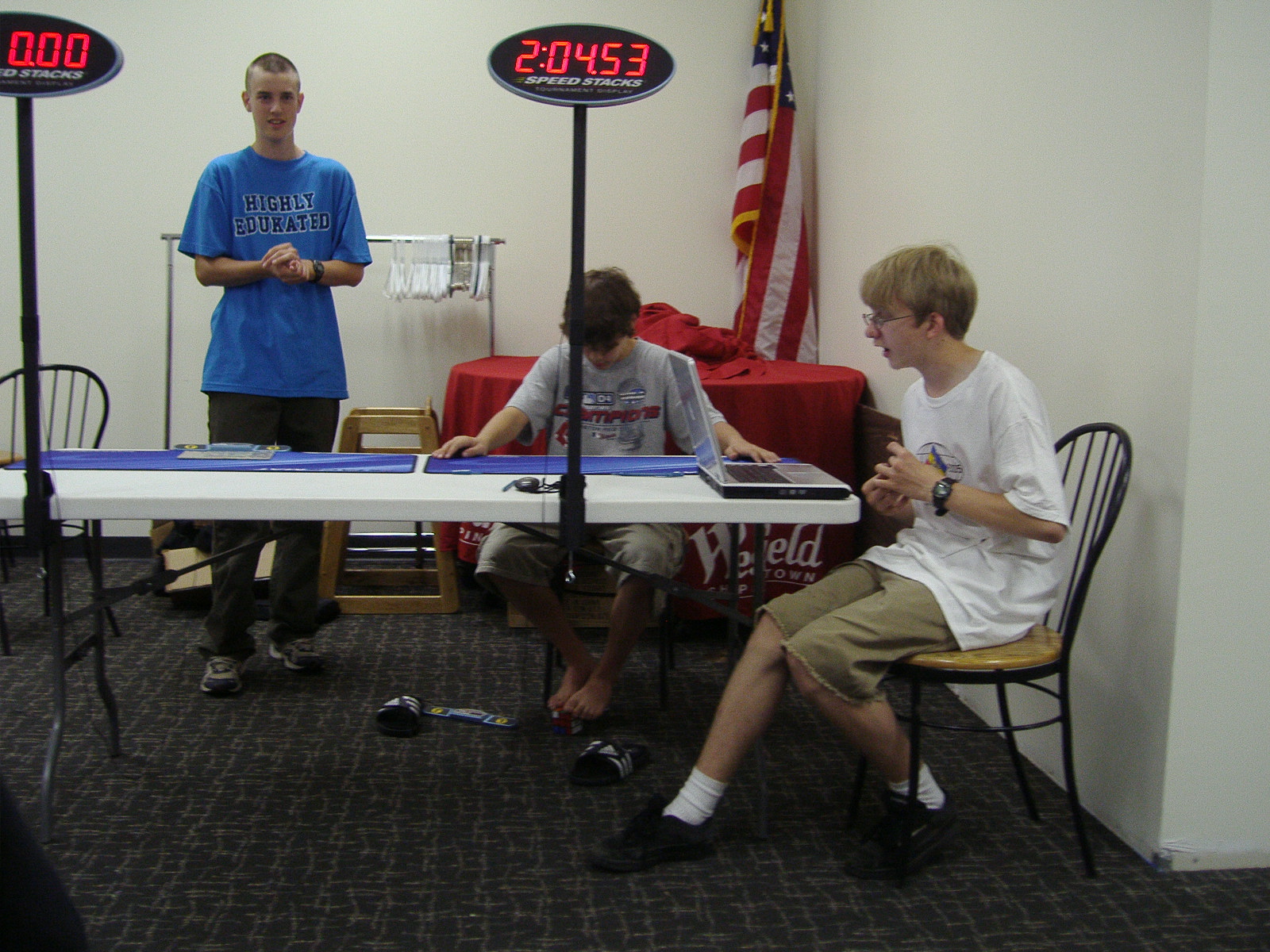 Closing ceremonies. Peter Greenwood announces the winners from the laptop. Scott Bedard (?) is doing some feet-cubing. Craig Bouchard poses with his "Highly Edukated" shirt.