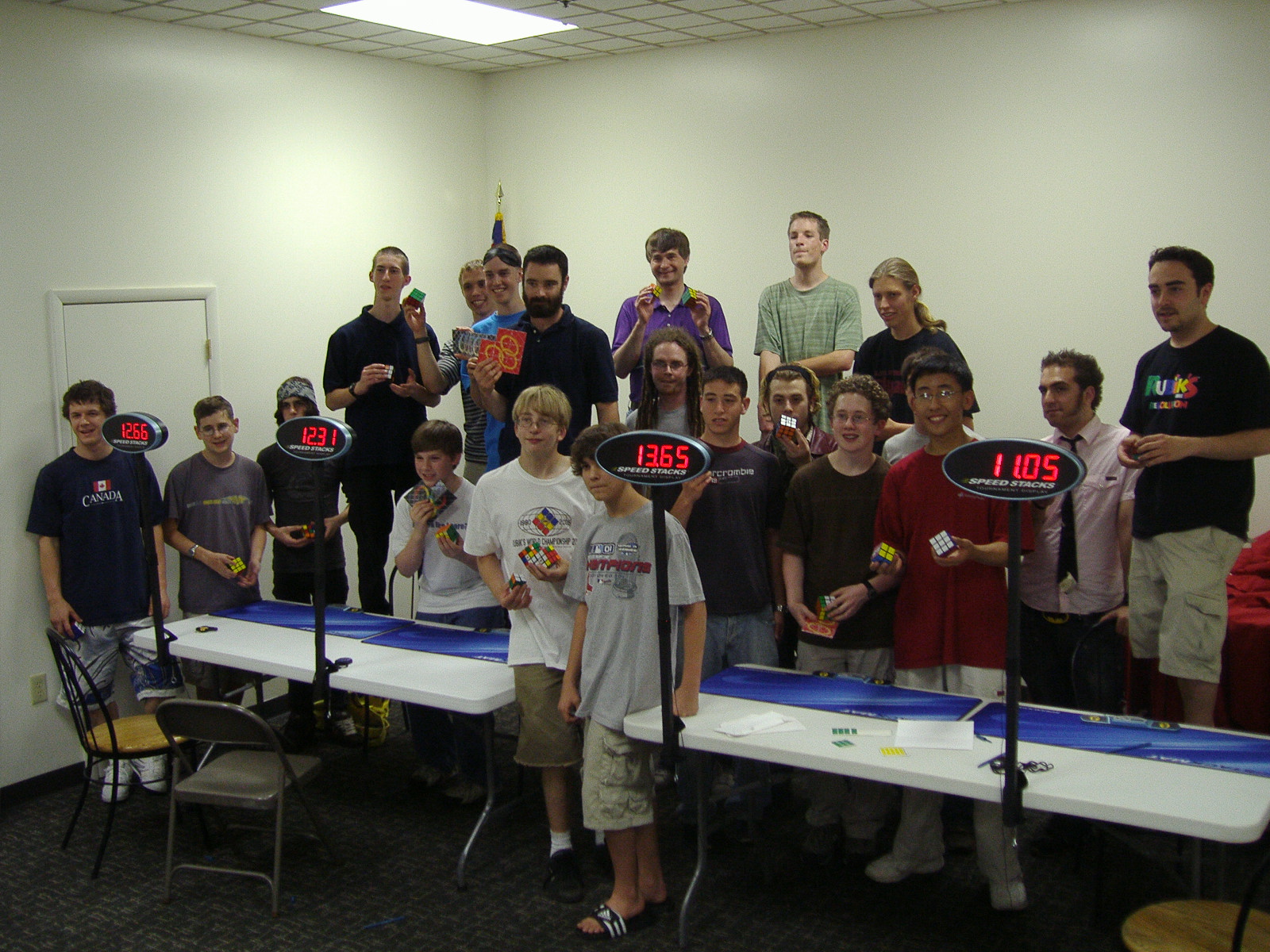 Group picture. The times displayed on the Stackmats were fake times we put up. If the 11.05 were a real 3x3x3 speedsolve, it would be the new world record.